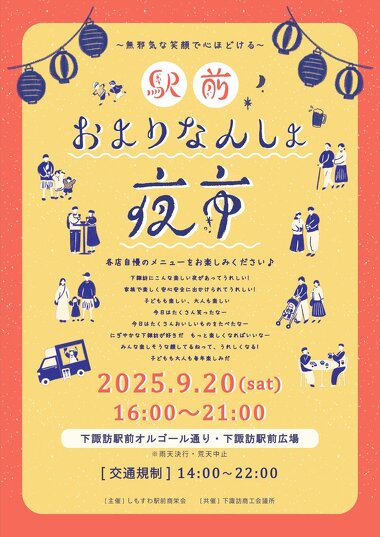 昨年に引き続き、下諏訪駅前のオルゴール通り&駅前広場を会場として『駅前およりなんしょ夜市』を駅前商栄会さんが開催します! ぜひお出かけください。 参加店舗の紹介や詳細はこちらから(イベント公式Instagr...