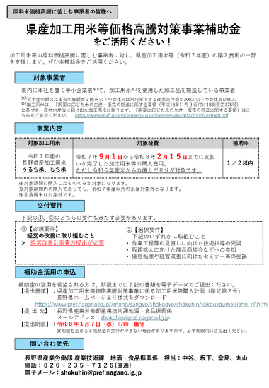 長野県では、原料価格高騰を受けた激変緩和措置として、県産加工用米等価格高騰対策事業を実施します。 ...