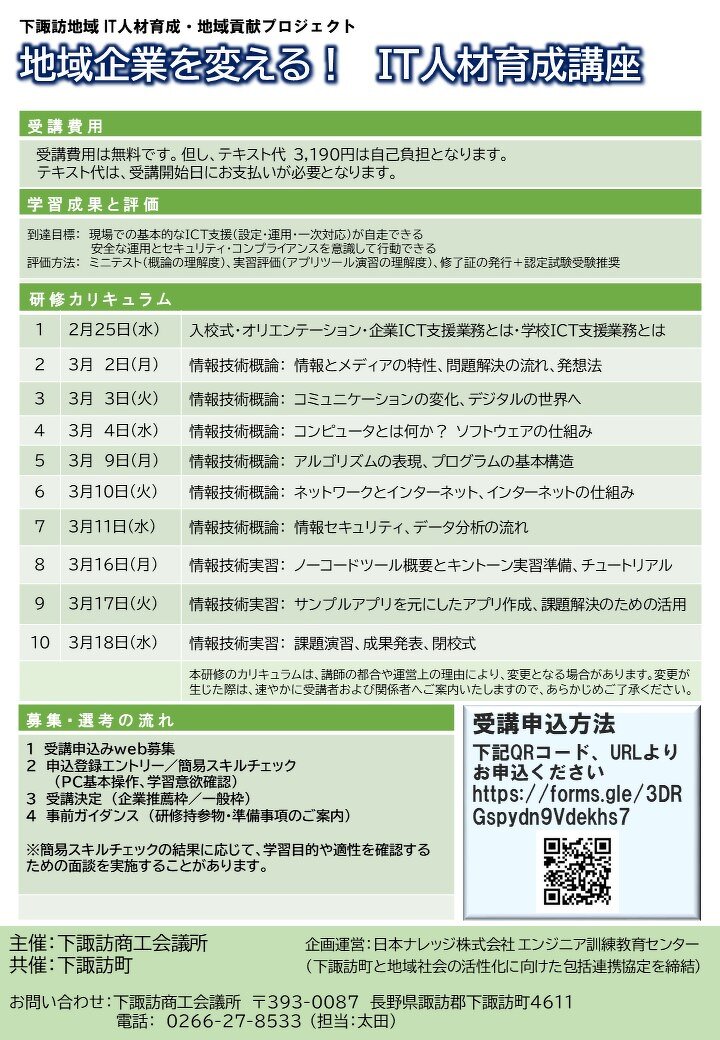 【1/19募集開始】下諏訪地域IT人材育成・地域貢献プロジェクト「IT人材育成講座」