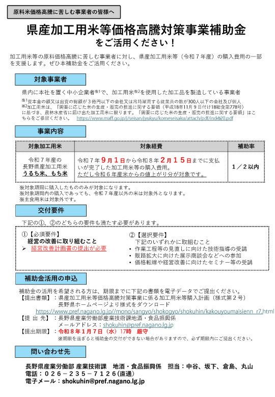 長野県では、原料価格高騰を受けた激変緩和措置として、県産加工用米等価格高騰対策事業を実施します。